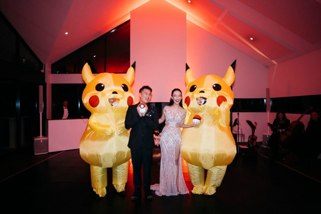 As night fell, the celebration continued with a long table dinner where wine from the region flowed freely, paired with heartfelt speeches that drew both laughter and tears. Just as guests thought the surprises were over, Ken’s siblings lit up the evening with a playful twist. They appeared on the dance floor dressed as Pikachu, the groom’s favorite character, bringing bursts of joy and childlike wonder that had everyone cheering and laughing.